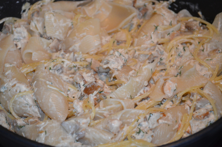 Когда сварится паста, переложить ее на сковородку (можно добавить немного воды из кастрюли, чтобы паста не была сухой).