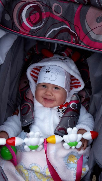 Дела наши идут хорошо, пару дней назад у нас проклюнулся зубик, пальчиком нащупывается остренький краешек, начинает вылазить потихоньку, но кусаться Соня начала хорошо, у мамы аж искры из глаз порой) я ее даже по попке шлепнула легонько, чтобы дать ей понять, что мне больно и так делать нежелательно, так она на меня обиделась, губки надула и заплакала, пришлось успокаивать)) Из умелок - активно ползаем на животе назад и по кругу, вперед ну никак не хотим, научилась переворачиваться с живота на бок и на спину, пытается сесть с четверенек, поднимает ногу, тянет ее назад, садиться на попу, а руками от пола оторваться боится, так и сидит - кричит, кряхтит и рычит но дальше никак. Любит махать руками по всему, что попадется - по мне, по папе, по игрушкам, по полу, а когда ничего нет, то себе по животу, приходится немного успокаивать ее, а то как разойдется, боюсь что что-нибудь себе отобьет)) Когда ее держишь, может пару минут хорошо и уверенно постоять - это ей так нравится, сразу улыбаться начинает.