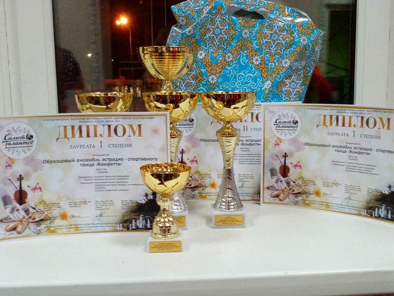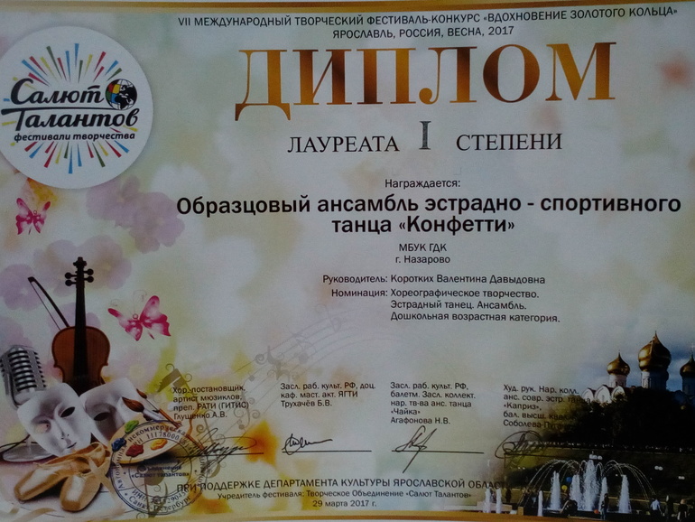 28 и 29 марта 2017 года в городе Ярославль талантливые дети со всей России встретились на VII творческом фестивале-конкурсе «Вдохновение Золотого кольца» в рамках международного проекта «Салют Талантов». Участие принял творческий коллектив г.Назарово Красноярского края - образцовый ансамбль эстрадно-спортивного танца "Конфетти" (балетмейстер Валентина Коротких, педагог Анастасия Коротких). На фестивале перед зрителями выступило более 600 юных талантов из различных уголков России: Ачинска, Воронежа, Железногорска, Москвы, Коломны, Нижнего Тагила, Омска, Санкт-Петербурга, Тулы, Уфы, Якутии, Дзержинска, Печоры, Мирного, Назарово и других городов. Участники представили конкурсные номера в различных номинациях. Ансамбль "Конфетти" прибыл на конкурс в составе более 20 участников - это младшая, где занимается моя доченька, и старшая группы коллектива.