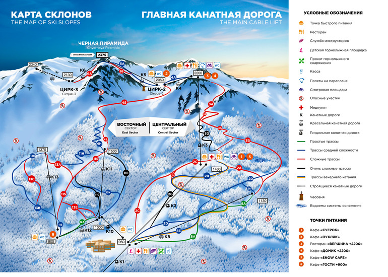 На горной каруселе созданы условия для райдеров всех уровней. Есть черные трассы, а есть и спокойные.