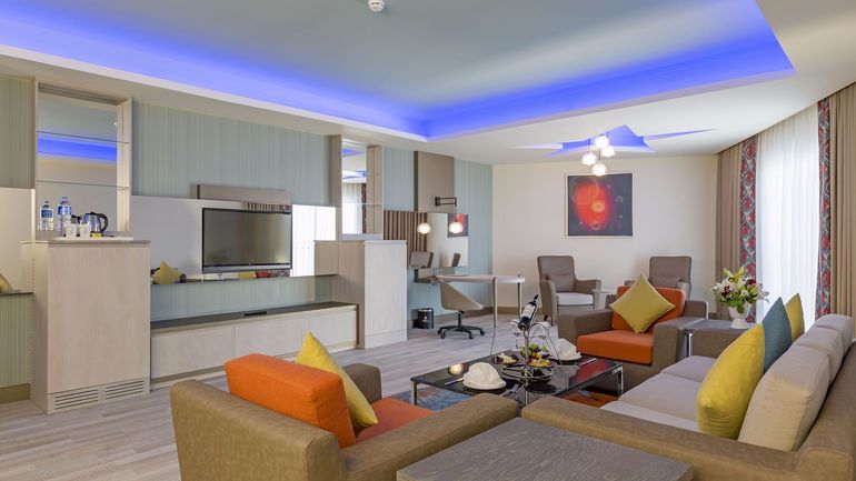 -8 Deluxе Suite (170 кв.м) холл при входе, 1 спальня, 1 гостиная, джакузи, с видом на бассейн и территорию, макс. 2+1 чел.-80 Dublex Family Rooms (120 кв.м) двухэтажный номер, 2 спальни, 2 ванные комнаты, макс. 4 чел