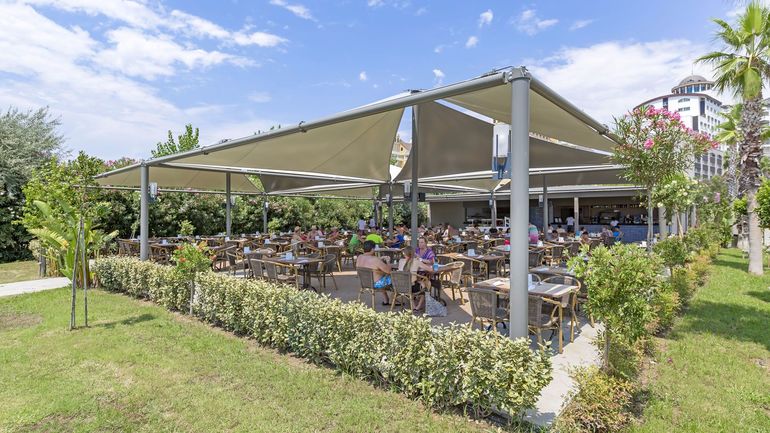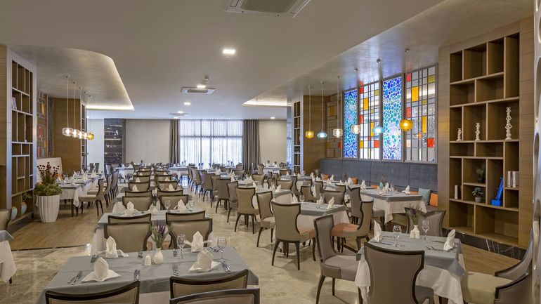 -основной ресторан с террасой ,9 A'la Carte ресторанов: морепродукты, итальянский, османский, мексиканский, суши, тапас, стейк, дальневосточный, теппаньяки (по предварительной резервации - платно) работают в определенные дни недели.