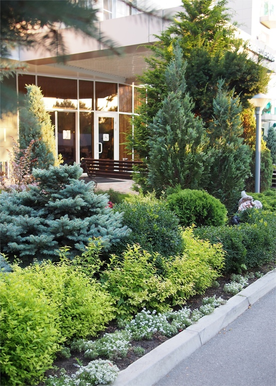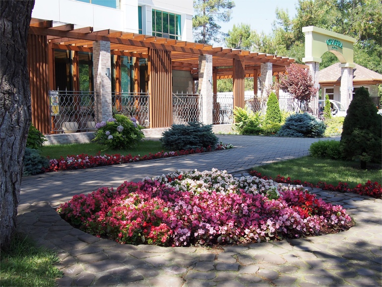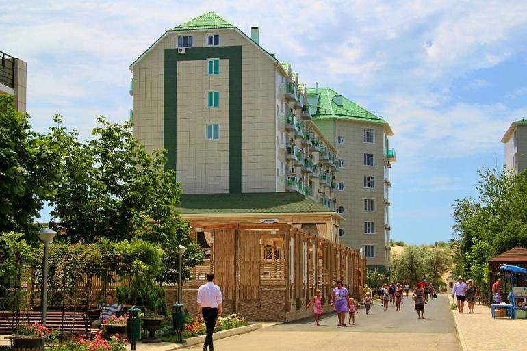 У пансионата есть собственная территория площадью, благоустроенная, охраняемая и огороженная. На ней среди уютных зон отдыха и площадок расположены 7 шести- и восьмиэтажных зданий с лифтами.