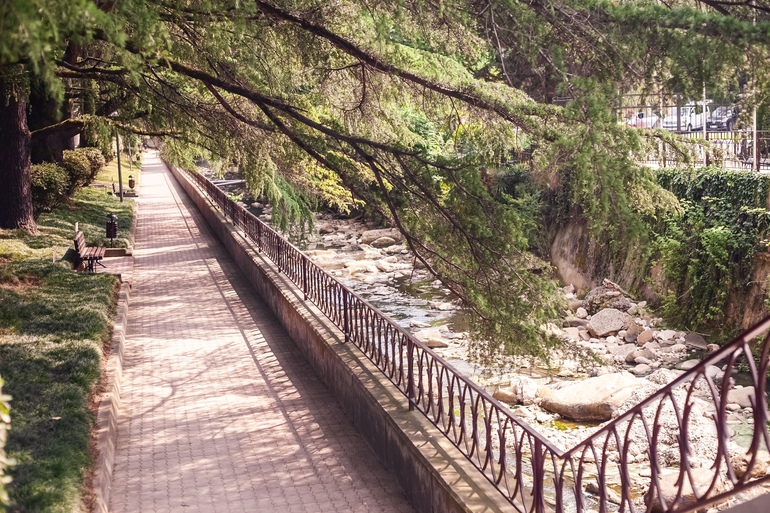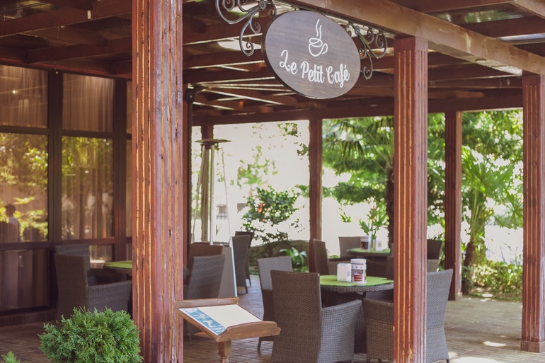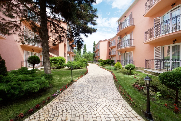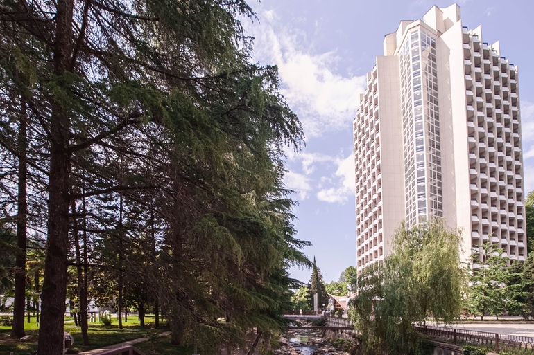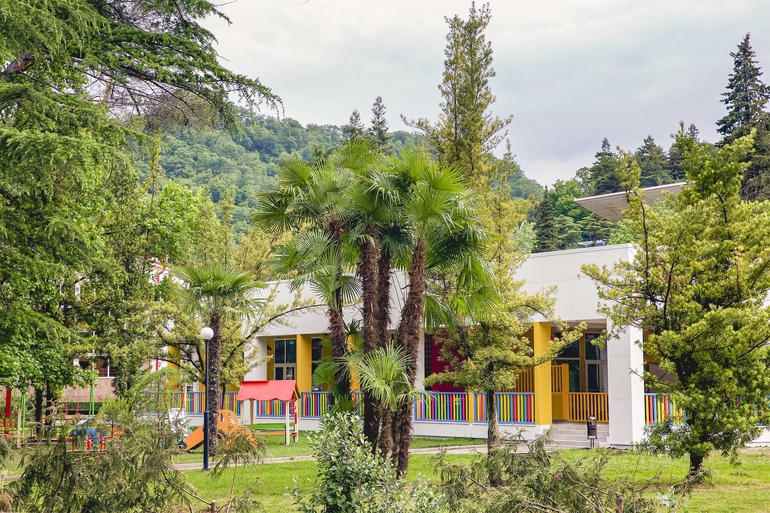 Неоспоримые преимущества курорта - расположение на первой береговой линии, собственный оборудованный пляж с набережной и анимационной сценой и обширная живописная территория с субтропическими растениями, где протекает горная река Агура, впадающая в Черное море.