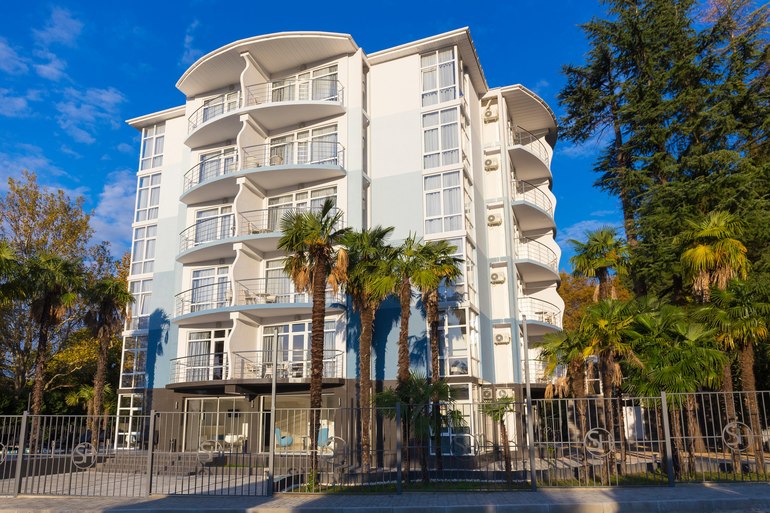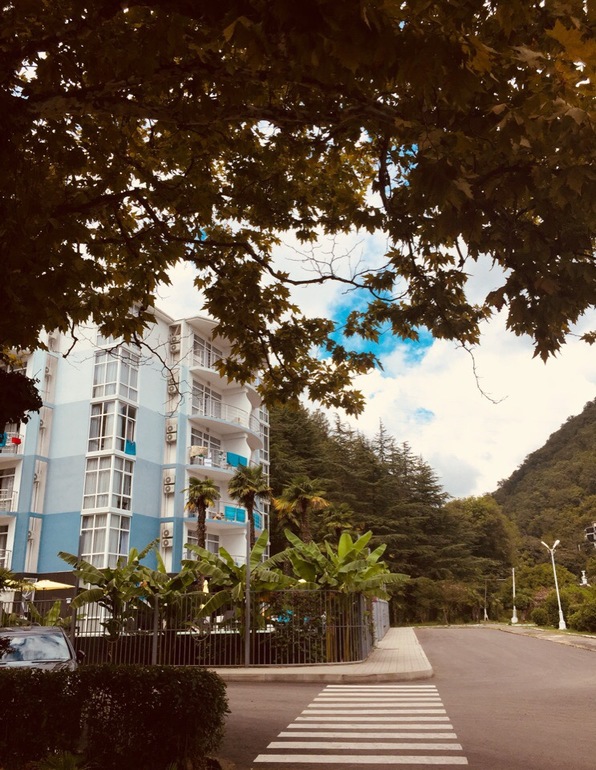 В составе пансионата «Арбика» в Пицунде - три корпуса с большими панорамными окнами и балконами.