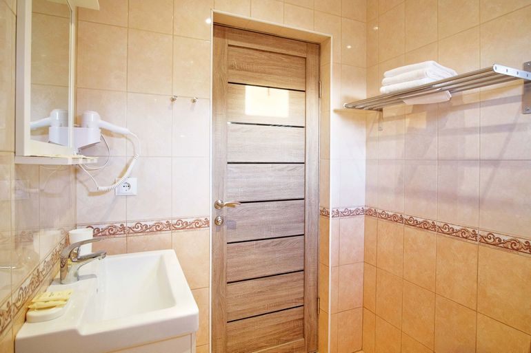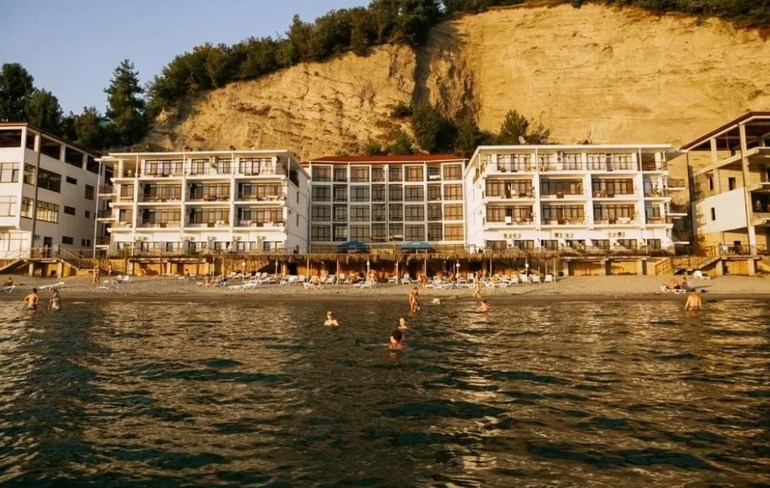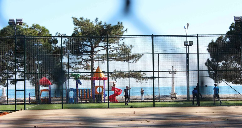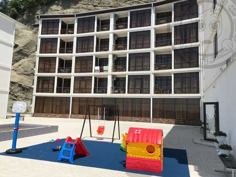 В 200 метрах от отеля прекрасный галечный пляж. А в 100 метрах детская площадка, футбольное поле
