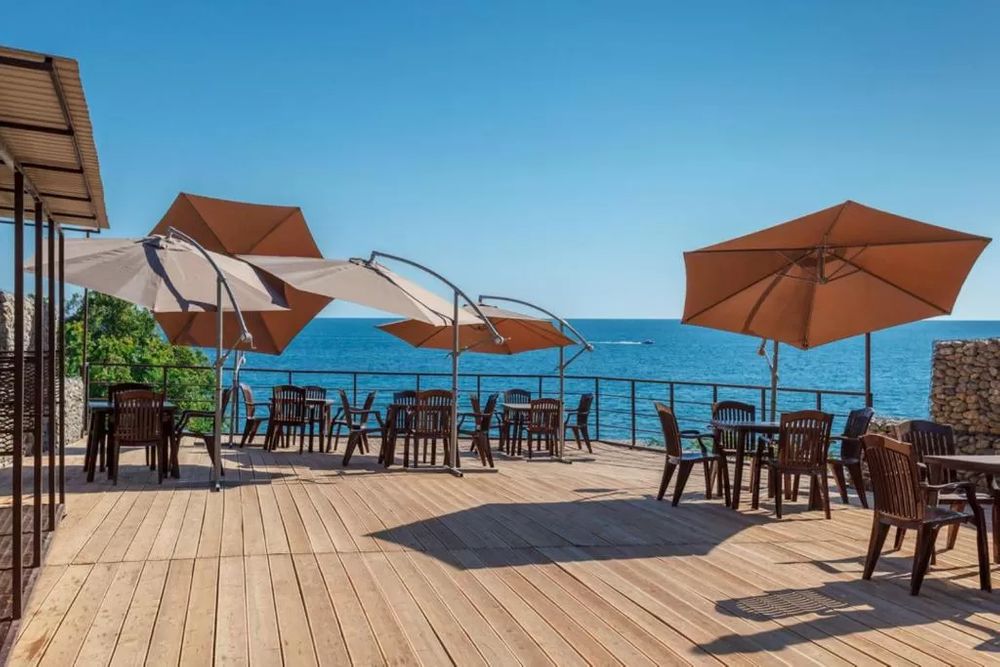В паре минут ходьбы находится поселковый галечный пляж. На пляже есть навесы, кабинки для переодевания, можно взять в аренду шезлонги.
