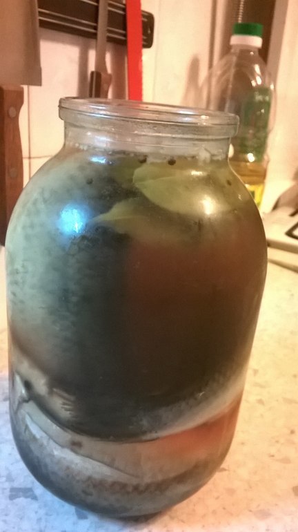Как все растворилось ставим охлаждаться, только не в очень холодное место(балкон), т.к. соль и сахар быстро закристаллизуются. Я оставляю при комнатной температуре. Селедку потрошу, но не делаю из неё филе. Просто вытаскиваю внутренности, мою и укладываю в банку. Вот еще момент! Так как покупать будете мороженую, то размораживать стоит только в холодильнике или хотя бы просто при комнатной температуре. Ни в коем случае не используйте микроволновку!