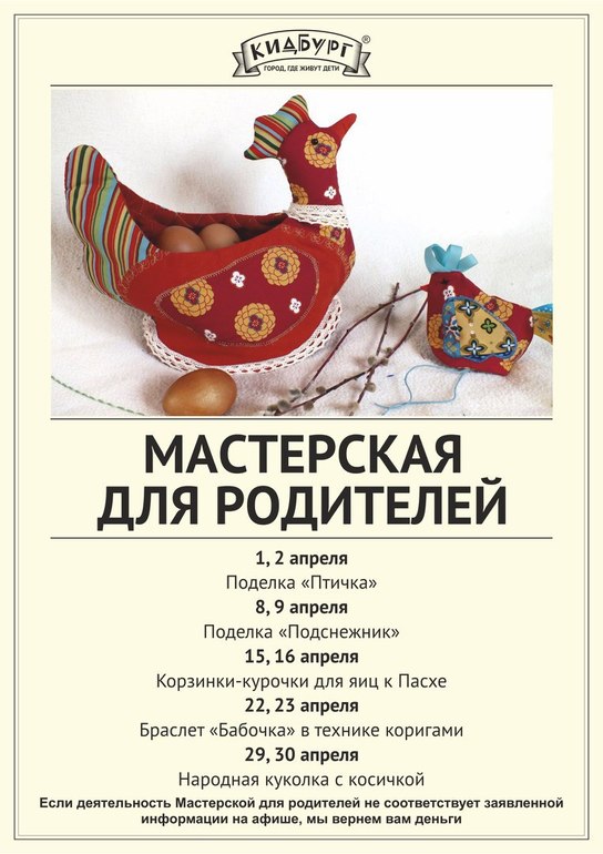 В апреле, специально для родителей, в Кидбурге в ТРК "Гранд Каньон" работает мастерская для родителей.