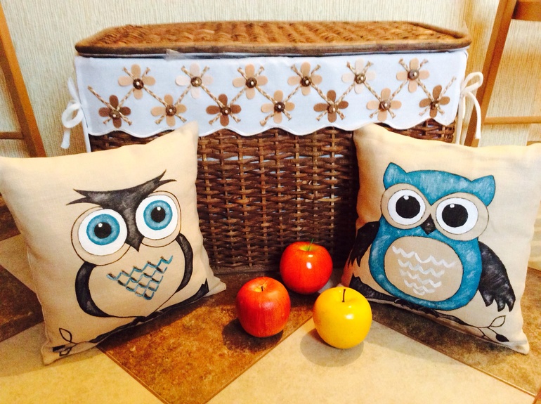 Подушечки 30 /30, материал бязь, синтепух, наволочка лен, роспись акрил краски по ткани, фурнитура пуговички и х/б кружево. Планирую добавить совушкам шоколадные бантики из лент, но еще думаю.