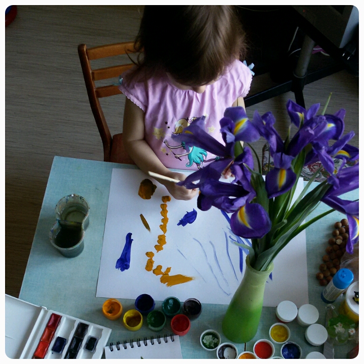 Вот творческое утро! Рисовали параллельно: я свои цветы, а Саша - свои ! Ирисы! Весенняя нежность! Я лишь вела беседу , о том как мы рисуем: овальчики- лепесточки, стебельки, листочки, которые тянутся вверх и т.п.