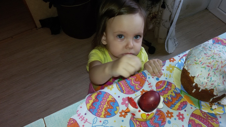 Какие у Вас яички красавицы))))Молодцы, ВЫ и Пасху творожную делали) А скатерть то, какая праздничная))))Сашулька самый милый пасхальный кролик))))))Наташенька, с Пасхой Вас)))))