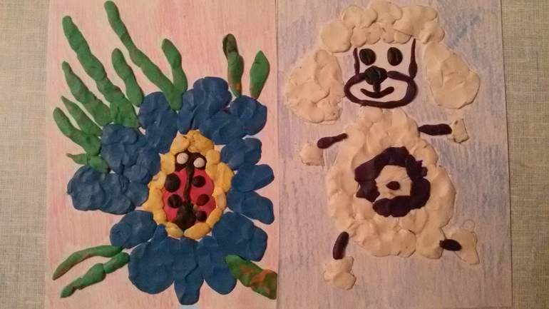 Пластилиновые картинки попробовали сделать впервые. Саше еще трудно размазывать пластилин пальчиками, но старалась. Ккатала ей шарики, она придавливала их пальчиком, пыталась размазать. Делали пару-тройку вечеров, для Саши тяжело долго сидеть , я и не настаивала. Конечно, я очень помогала, рисовала картинки сама, разогревала пластилин в своих руках, Саша потом приноровилась и стала сама отщипывать кусочки пластилина и лепить их на картинку. Вот что получилось: