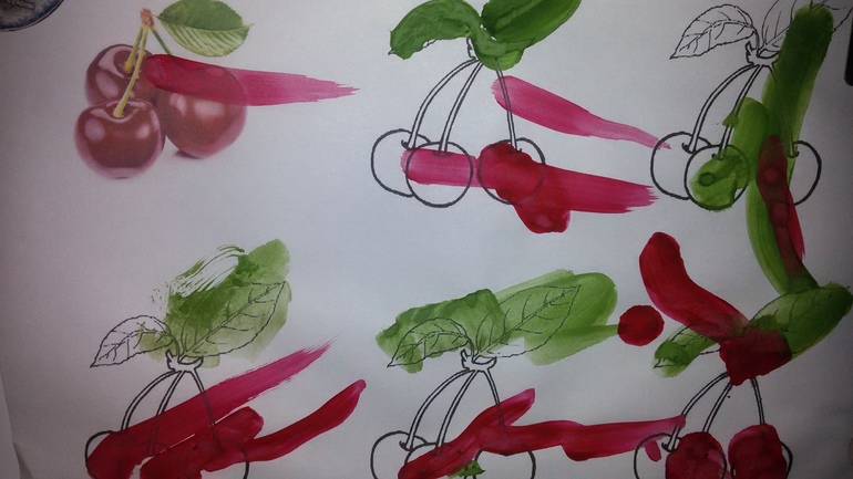 Мы рисуем, не забываем. Но как-то все идет не так как мне хотелось бы. Ну мало ли чего хочется мне!. Ребенок все видит по-своему. Саша исключает принцип рука в руке. Как только я беру ее ручку с кисточкой в свою, пытаюсь направить, чуть показать, то сразу крик негодования, выдергивает руку и ....... ну понятно ! делает все по-своему!!!! А вот по-своему как-то странно стала рисовать. Раньше могла закрасить предложенную ей фигуру, а сейчас проводит горизонтальную линию и все... ,требуя другой лист бумаги ( получаются просто черточки). Вот раскрашивали ягодки. ( перед этим вроде бы рассказала-показала ягодки. Может недостаточно?!). Вот здесь отчетливо видны черточки-полосочки.