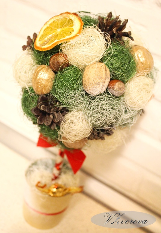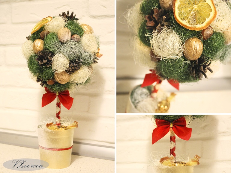 ТопиарииНедавно к моему одному из самых популярных веночков "В поисках конфеток" заказали в комплепт топиарий. Вот такое деревце у меня получилось, называется оно "Волшебство") Как и в веночке, основная цветовая гамма - красный, золотой и зеленый. И, конечно, топиарий прячет в себе две золотые конфетки)