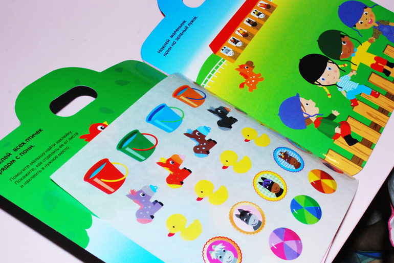 Indoor activityУ нас есть обычные книги, книги интерактивные, даже такие, которые сами сказку рассказывают, когда их открываешь, а теперь мы полюбили книги с наклейками. Можем подолгу сидеть и переклеивать животных или предметы, придумывая истории.