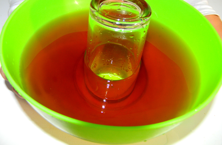 опускаем стакан в воду и видим что вода действительно не попала внутрь (вот для чего мы окрасили воду, что бы увидеть!)