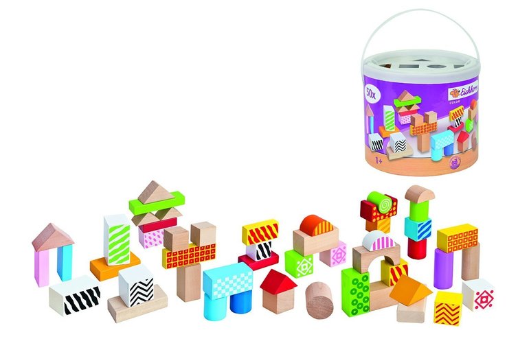 В 10 месяцев только начали понемногу с ними играть. до этого просто стучали один о другой, сейчас уже понемногу вместе учимся строить. Кубики разных размеров, есть яркие окрашенные, и натуральные без покрытия в наборе. Крышка имеет прорези разной формы и одновременно служит сортером.