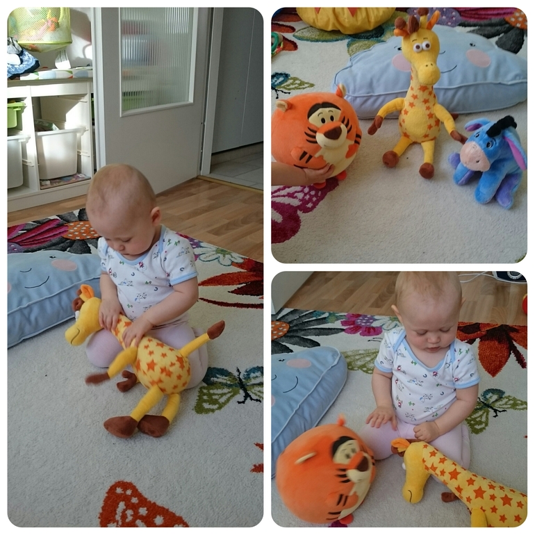 Интерес к мягким игрушкам появился почти в 10месяцев. Жираф-любимый,таскает его за собой,снимает на нем стресс,все лучше,чем кошака трепать))))) и да,надо же на комто глазки-носик-ротик показывать)))