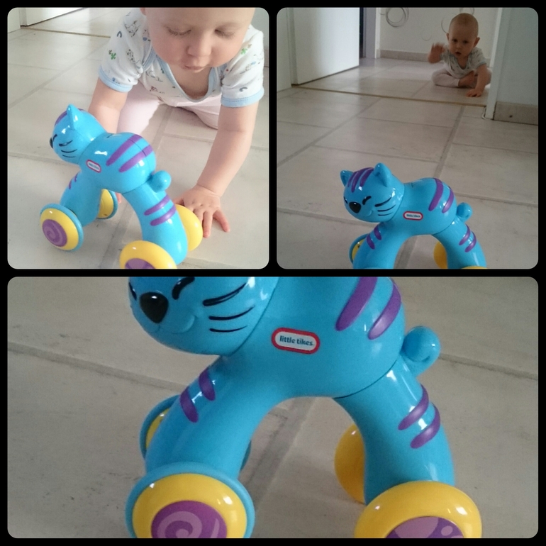 У мальчиков есть машинки, а что делать девочкам? А девочкам покупаются вот такие милые киски. Если на нее сверху чуть нажать рукой,она поедет сама. Стимулирует ползанье отлично,гоняем каждый день ребенка этой штучкой,да и сама длчка ее запускает и ползет за ней.
