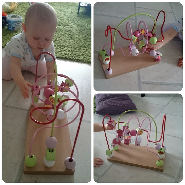 Хорошо развивает ручки,занимает не надолго, но минут 10 деть возится с бусинами уже в 7-8 месяцев. Кстати этого добра завались на блошиных рынках, наш я купила за 2 евро.