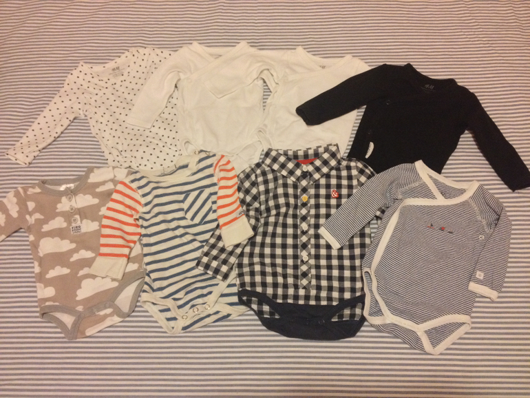 Фото №6: верхний ряд по 100 руб. все H&M. Черный и белый со звездами р. 2-4 мес., белые - 1-2 мес. Серый с облаками Farg Form Sweden р.1-2 мес. - 200 руб, полосатый Ebbe (Швеция) р. 0-3 мес - 100 руб; рубашка Mamas&Papas р.3-6 (одевали 1 раз ) - 250 руб; полосатый с запахом Le Petit Bateau р.0-3 - 200 руб