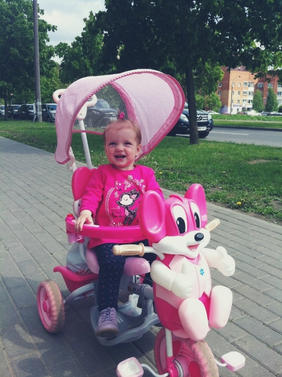 Но если бы всё было та просто,не было бы так интересно!Бордюры,ступеньки,спуски-наша страсть!Если найдёт,будет ходить туда-сюда и увести с этого "волшебного места" удаётся только силой и со слезами!Стараюсь гулять ближе к дому,тягать её тяжело стало,а как писала выше,транспорт не признаёт!Вечером мы гуляем уже втроём,к нам присоединяется наш папа и с горем пополам мы можем проехать сидя на велосипеде,но постоянно ёрзая,были случаи когда она просто выезжала из под перекладины)...иногда на помощь приходят сушки,но в последнее время и они не интересуют)