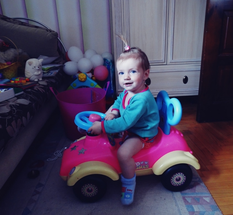 сама на машине ездить не хочет,хочет чтобы её катали!особенно с папой любит ездить...на скорости)мама катает в лайтовом варианте)