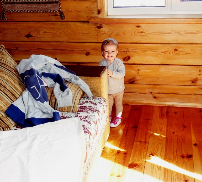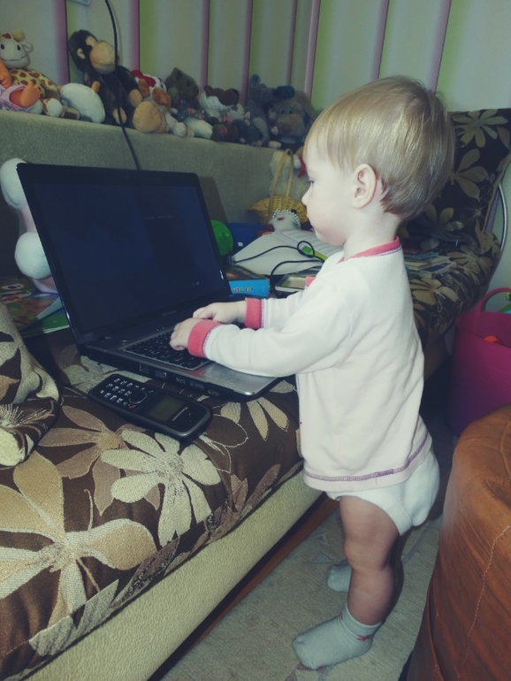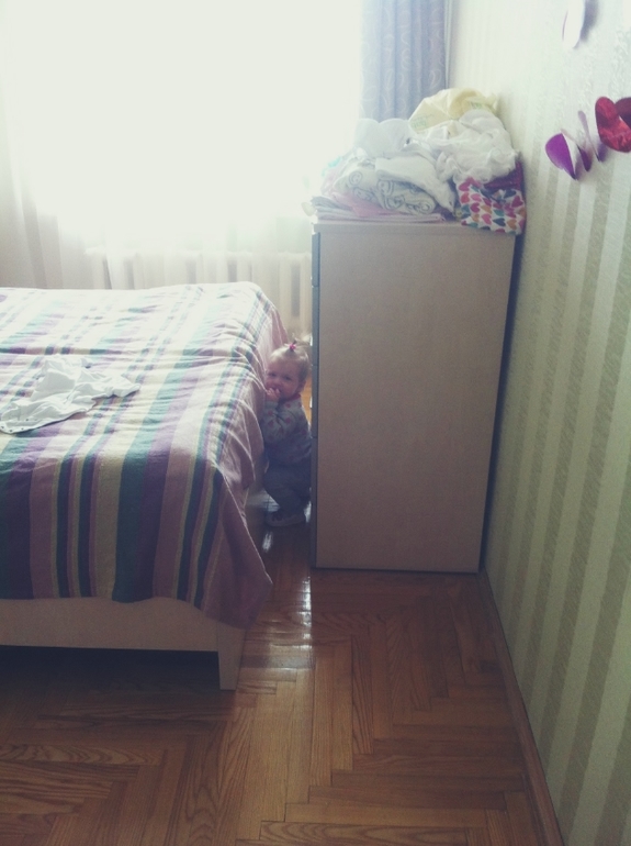 Переодеть Соньку стало проблемно!и это мягко сказано...одеваемся мы на лету/на ходу/на бегу!Я уже не помню,когда я последний раз натягивала на неё памперс лёжа...только стоя!Любит бегать голышом!Если видит одежду,сразу на утёк!Научилась забираться на диван,падала неоднократно,но всё равно лезет!Акробат растёт.