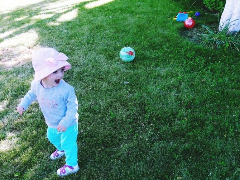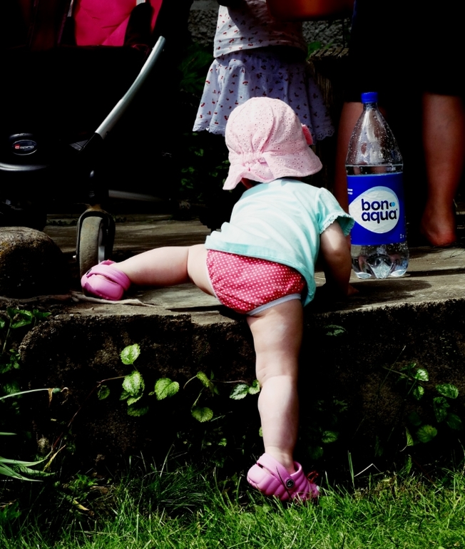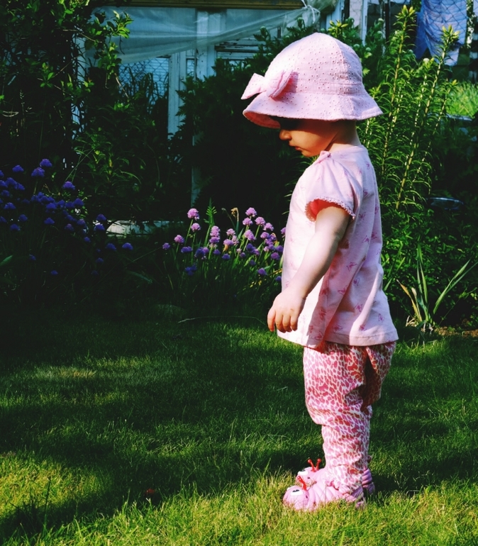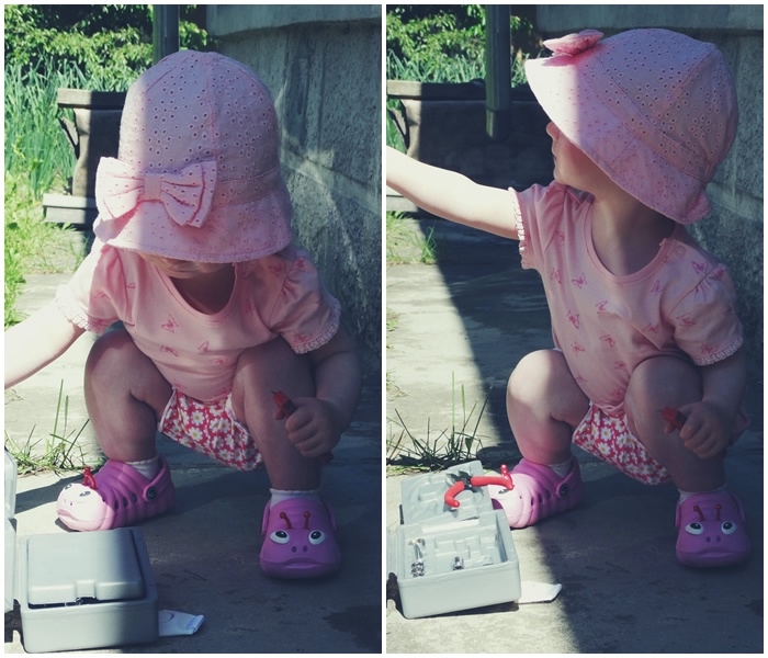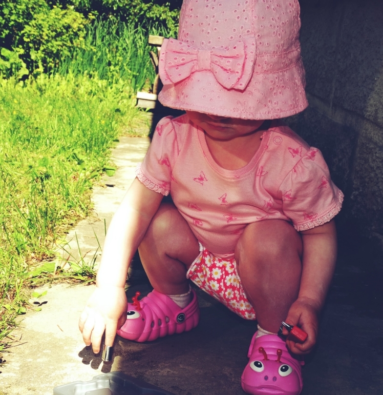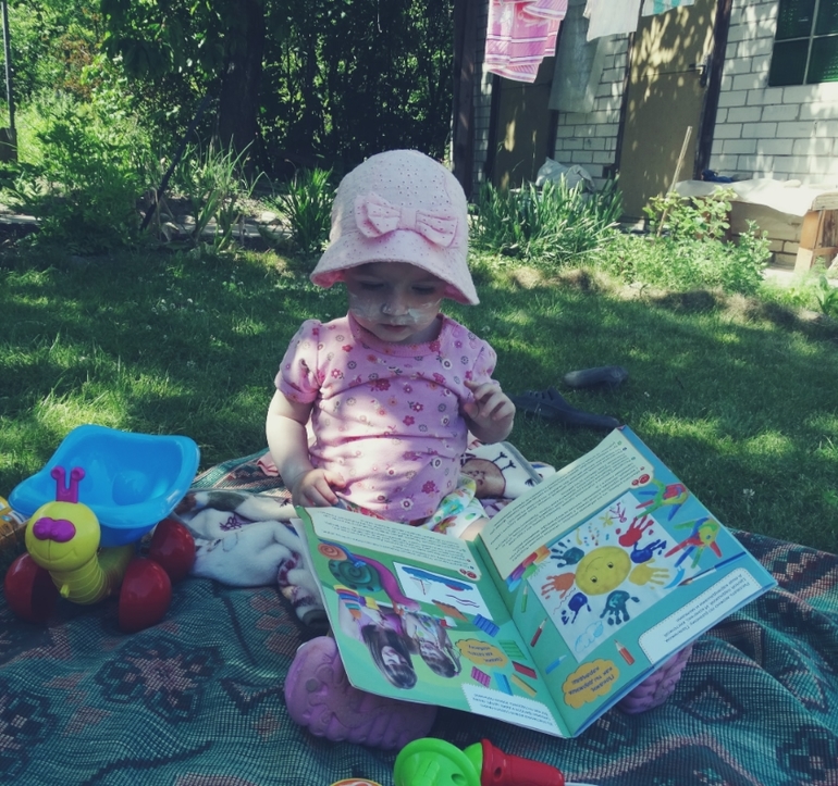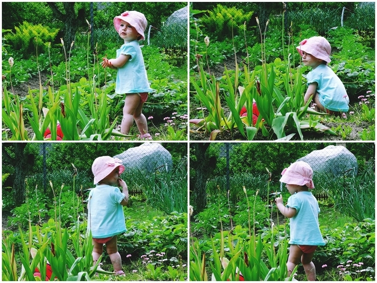 Пыталась снять носки и дать побегать по травке,но моя городская дочурка(как и я),ни шагу не сделал босиком!Стояла на месте и тянула руки))в носках дела обстояли лучше...ходила)всё время собирала камни и все вылизывала,как ни старались следить....всё равно умудрялась засунуть их в рот!Постоянно тягала за собой вёдра и метёлки,подметала тротуарчики!Частенько заглядывала на грядку с зелёным луком,где попутно перекусывала им же!Ела клубнику...ттт,не высыпало нас)Проводить время в доме отказывалась наотрез,сразу бежала к двери!ну и конечно лестница была любимым препятствием!Помогала папе в "машинных делах"!Облюбовала все его наборы)