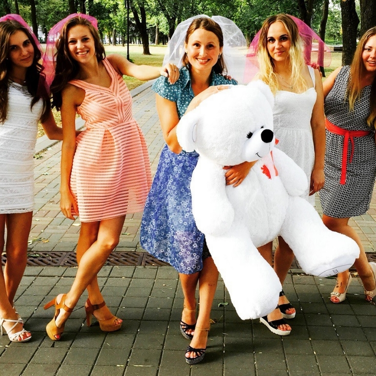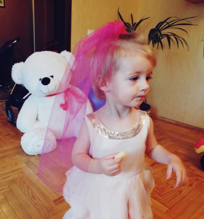 Соня посетила свой первый девичник!Моя двоюродная сестрёнка скоро выходит замуж)так вот у моей карамельки была фата,платье...все как положено)На все мероприятие я её конечно не брала,но на торжественной части девичника она присутствовала!!!