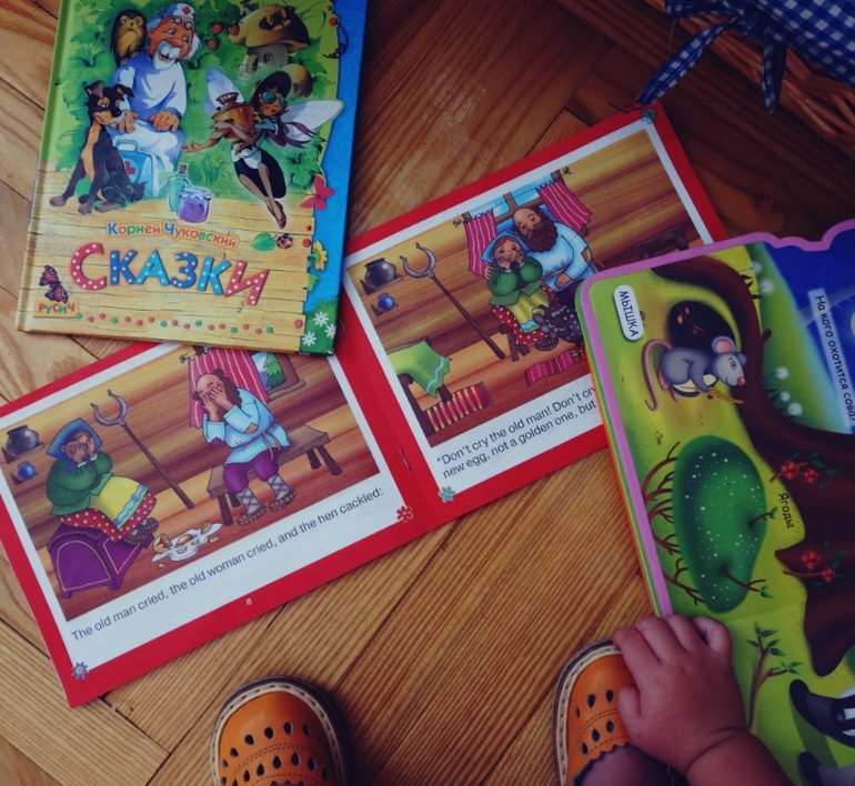 Пытается сложить губки и показать рыбку,очень забавно получается!Переваливается с ноги на ногу и рычит,как мишка)В книгах на волка говорит ГА!Очень любит книги,тащит и усаживает меня рядом,выбирает книгу и я начинаю показывать ей картинки,обязательно надо пальцем показывать,если не делаю этого,то сама берет мой палец!Достала даже мою энциклопедию и рассматривает картинки там,особенно ей полюбилась обезьянки,которых она целует!Из всех животных именно им бусю даёт!Цветы на картинках нюхаем,на улице и в магазине тоже!Умеет давать воздушный поцелуй.