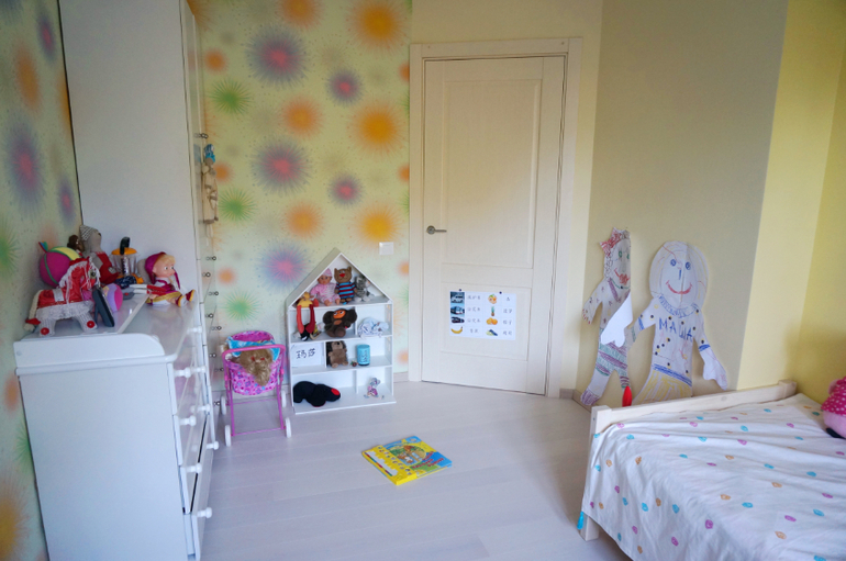 Вот такой получилась комната, Маша ее очень любит, сразу после переезда, она как-то повзрослела, осознала свое личное пространство в этом мире, где не надо было больше ютиться всем вместе на одном пяточке. Она с удовольствием спит одна и приходит к нам только утром сама.