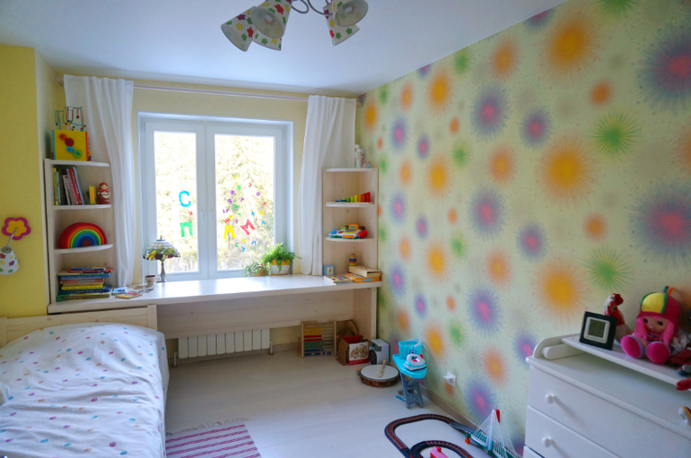 Пол и потолок абсолютно белые, желтая ниша для кровати (кстати совсем недавно Маша стала спать в большой кровати без бортов, мы решили не покупать промежуточный вариант, не тратить деньги, а сразу сделать ложе на долгие годы), и яркая стена с "салютиками". Конечно, когда ребенок подрастет, скорее всего, мы сделаем более строгую комнату, но пока яркое радужное настроение, которое должно быть у любого ребенка в детстве.