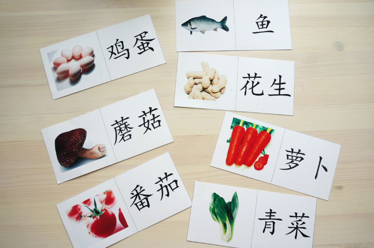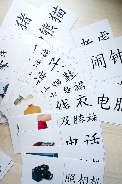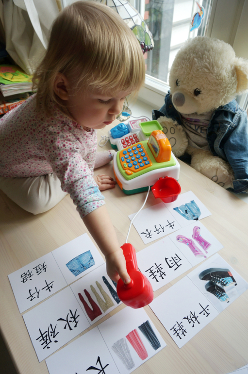 Занимаясь немного по методу Шичиды, мне казалось, что с китайским будет также, карты, иероглифы, слова...но оказалось, что не каждое слово означает 1 иероглиф, все гораздо сложнее, материала в интернете много, но не для маленьких деток, и не в том формате, как мне хочется. Мы озадачились с девочками, я решила, что буду готовить карты по теме, а они мне прописывать иероглифы. Занятие трудное, кропотливое, но оно стоит того. Теперь по дому у нас висят карточки с иероглифами и картинками к ним. У нас распечатана уже солидная стопка карт для игр - сюда входит и быстрый просмотр карт, и просмотр с акцентами на какие-то предметы, и сортировка по заданной теме, и игры, такие как магазин - я прихожу что-то покупать (продукты, одежда), а Маша продает мне и пробивает чек. Задача состоит в том, чтобы максимально часто в игровой форме ребенок видел иероглифы и запоминал их написание. В этом возрасте сделать это очень легко, так как нет логического мышления, все запоминается, как картинка. Пока я не устраиваю никаких проверок и тестов, не гоню, просто даю время впитывать, накапливать пассивно.