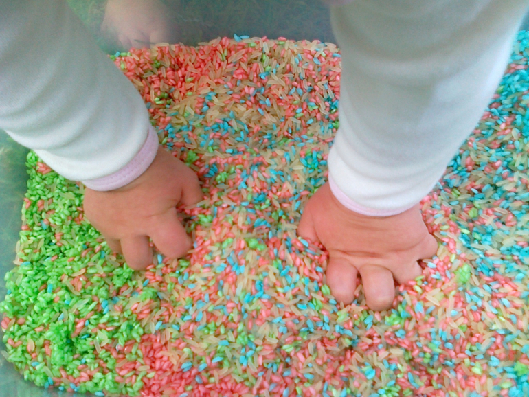 Моторика и сенсорикаНе секрет, что с крупами можно играть в любых вариациях. Традиционно система Монтессори предлагает пересыпать злаки из разных емкостей, что все наверное и делают. Есть еще один яркий вариант - покрасить рис. Берется пищевой краситель (у меня был гелиевый), добавляется в 0,5 кг риса, ложка уксуса и перетирается в пакетике (закрытом) пока не впитается равномерно краска. Затем высыпается в емкость и сушиться до полного высыхания. У кого-то ээто займет час, мой почему-то сох 3 дня, видимо краситель был не очень((. Насыпаем в контейнер равномерными слоями, даем ребенку полюбоваться красотой цвета, а потом предлагаем играть. Иногда не знаешь, как чадо повернет игру. Я надеялась на традиционные пересыпания, а моя Маша сняла туфли,носки и начала месить рис ногами, а потом брать его в ладошки и делать салютики, благо мы играли на улице.