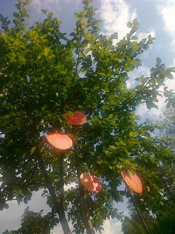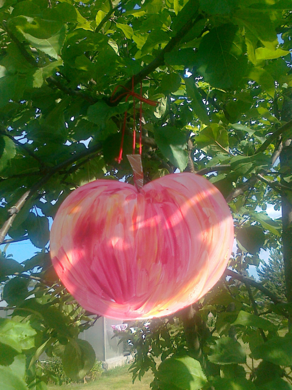 ТворчествоУ нас на даче есть 2 больших яблони, они дают большой урожай, но пока плоды маленькие, мы с Машей нарисовали свои наливные яблочки и повесили на дерево. По сути - визуализация желания, чего хотим достичь)) Такой вот land art получился.