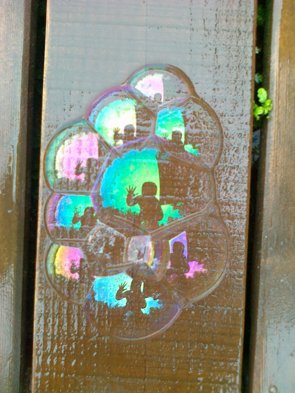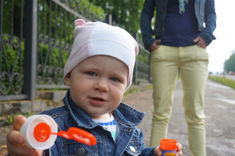 На улицеKюбовь к мыльным пузырям началась, когда мы оказались свидетелями шоу мыльных пузырей на свадьбе моей подруги. Маша смотрела на них, как завороженная, а потом еще залезла со мной в мыльный пузырь! А потом понеслось...сначала дула я, потом я держала палочку, она училась дуть, потом она перехватила инициативу самой держать палочку и дуть, затем я долго не поддавалась, чтобы отдать ей открытый флакон с жидкостью, но устала его держать, тк прогулки превратились исключительно в пузырепускание, и отдала...проливали мы много и часто...в день у нас уходило по 2 бутылки пузырей...папа покупал их коробками в детском мире...в итоге, Маша научилась дуть, держать и вообще развлекаться с пузырями сама! а потом начались вариации..дуть через крупное и огромное кольцо, через ниточки и палочки, в дождливую погоду, когда влажность очень высокая и пузыри долго не ломаются, можно на них наступать и ловить. Одним словом, мыльная опера!
