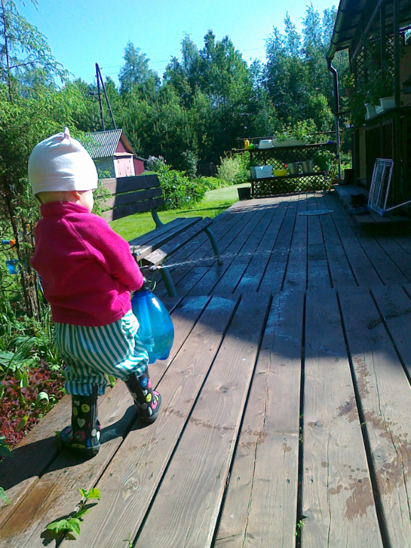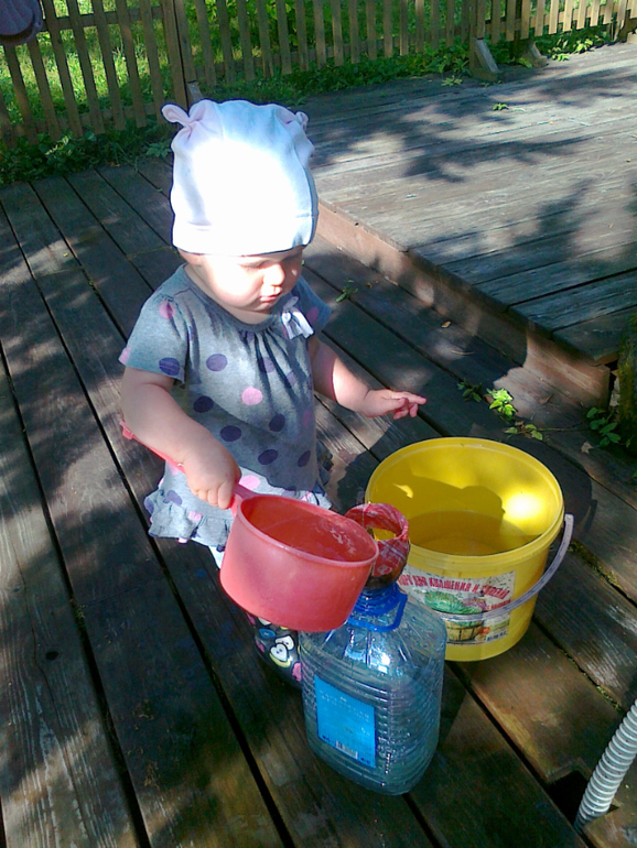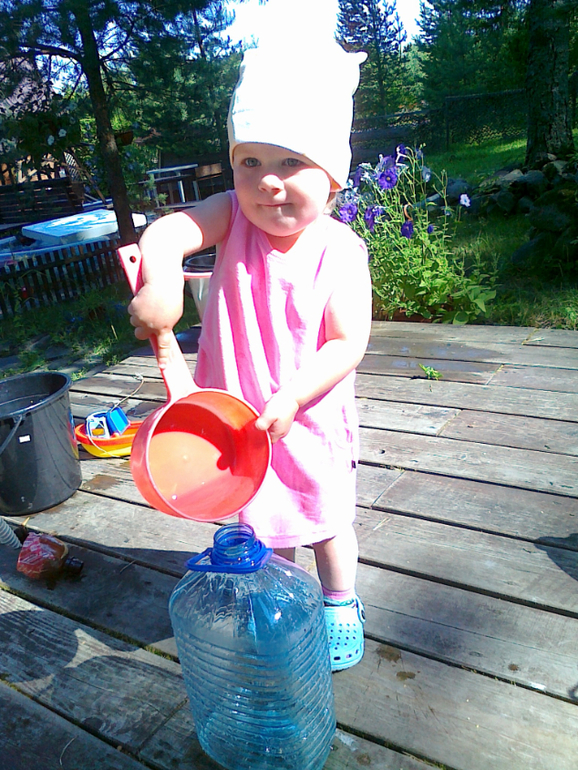 ВодаОдним из основных занятий по системе Монтессори является всяческое переливание воды, именно этим Маша и занимается сама на даче! Сплошные поливалки, вход идет ведра, тазы, брызгалки, канистры, лейки и многое другое...