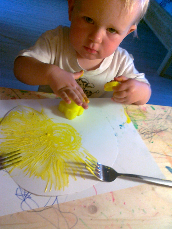 РисованиеОдним из оригинальных видов рисования - является рисование вилкой. На первый взгляд, если порыться в интернете, можно найти много разных образов, которые создаются очень легко, но когда приступаешь к делу, понимаешь, что это не совсем так. Мы с Машей рисовали одуванчик, но вилка далеко не кисточка, мажет красиво, но не длинно. Ребенку быстро надоело, а я увлеклась и доделала. Решила взять на заметку этот метод и попробовать его чуть позже.