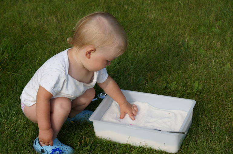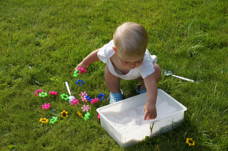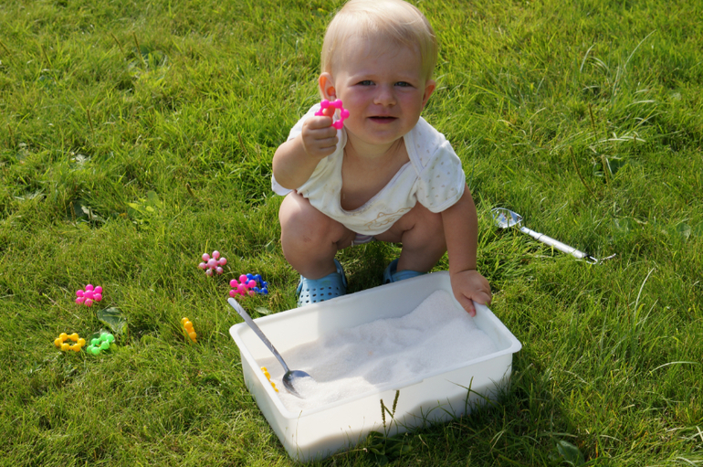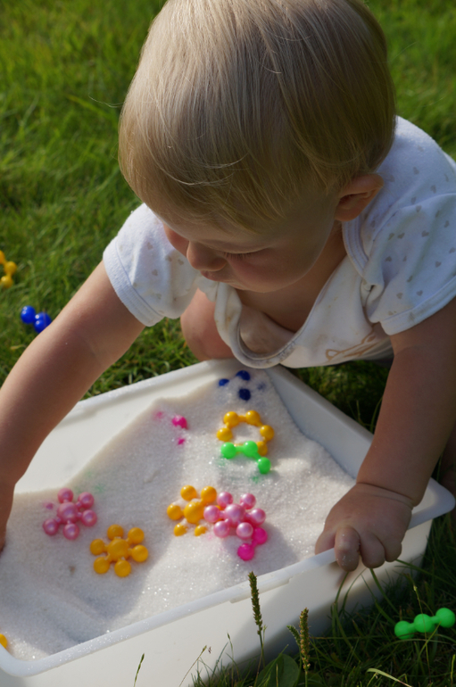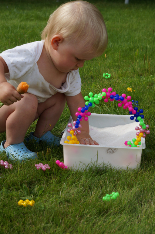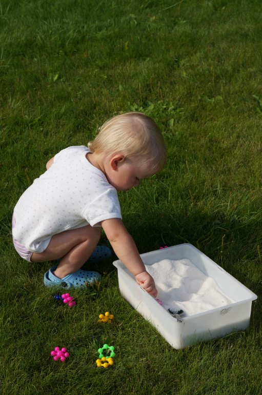 Моторика и сенсорикаНедавно купила Маше новый конструктор, но решила не отдавать его просто так. В шкафу завалялся мешок сахарного песка, который был куплен для варки клубничного варенья, но поскольку ягодки все съедались свежими, то остался без дела. Засыпала этим сладким чудом детальки конструктора и отправила дочь на раскопки. Как всегда, сначала пальчиком, потом двумя руками, потом ложками, потом кидалки-посыпалки, но все детальки были найдены. Мы создали из них гусеницу, которая завалилась на газон - греться на солнышке. А потом, когда надоело, мы ее разобрали и поиграли немного в отпечатки и тыкалки с кинетическим песком, о котором я писала тут.