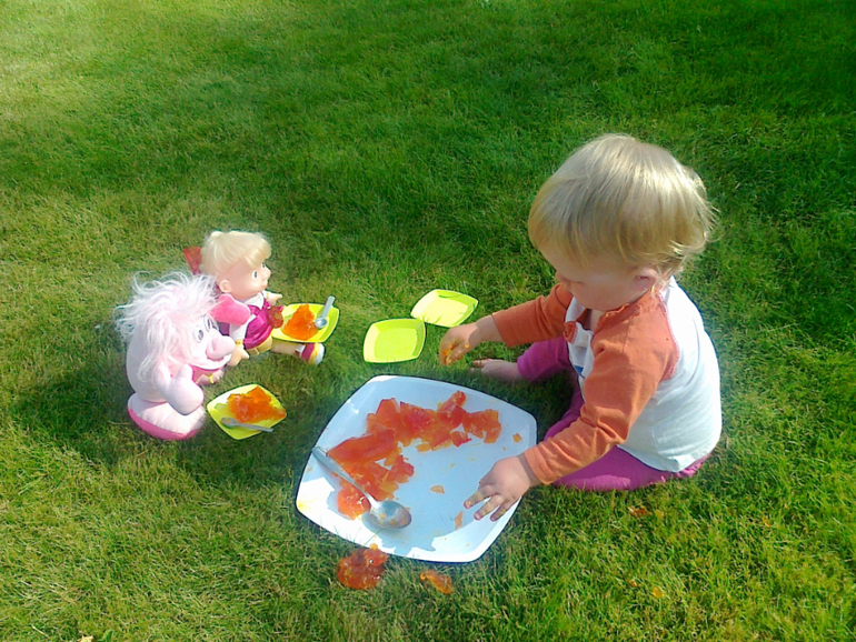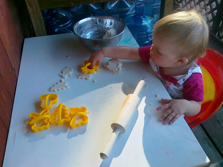 Все в детстве читают сказку Репка, но сейчас у Маши (1,6 года) такой любознательный период, что усадить за книжку ее очень трудно, поэтому мы решили поиграть в репку "в натуре" (для узнавания сюжета). У нас давно лежал подаренные деревянный набор "Репка", вот мы его и использовали за основу. Я заранее приготовила тесто для игры (на основе муки, воды, какао, соли и оливкового масла), что стало нашим огородом. Мы туда сажали репку. а потом потихоньку тянули со всеми героями. Когда надоело, то перешли просто к лепки теста, изготовлению рулетиков, тыканью ножом, а потом и прорезанию дырочек детским дуршлагом. По окончании игры, пошли в огород, сорвали настоящую репку (чтоб понимать о чем речь) и съели ее, благо дело было на даче.