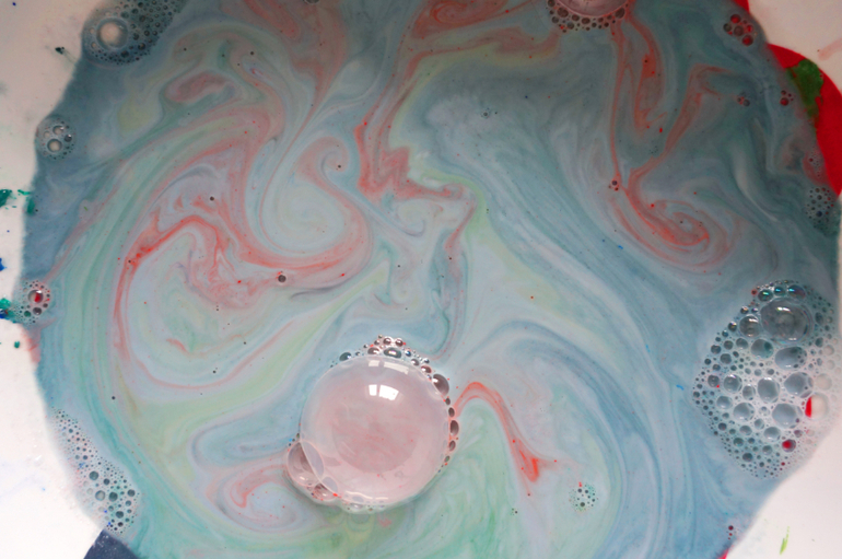 Рисовать на молоке не пробовал только ленивый. У нас с Машей как-то не случалось опробовать этот вид творчества, а тут остался просроченный литр молока в холодильнике. Решила, что время пришло. Жидкость налила в большую глубокую тарелку, дала дочке гуашь и кисточку предварительно смочила в жидкости для мытья посуды. Рисунки и разводы получаются фантастические, они словно летают на поверхности молока, но Маше трудно пока долго наблюдать за этим процессом, поэтому восторг вызвало смешивание красок руками, которые мы потом для эффекта тоже смазали жидкостью для посуды. Давно я не давала ей пальчикового рисования, видимо, она дорвалась, поэтому получилась молочная буря!