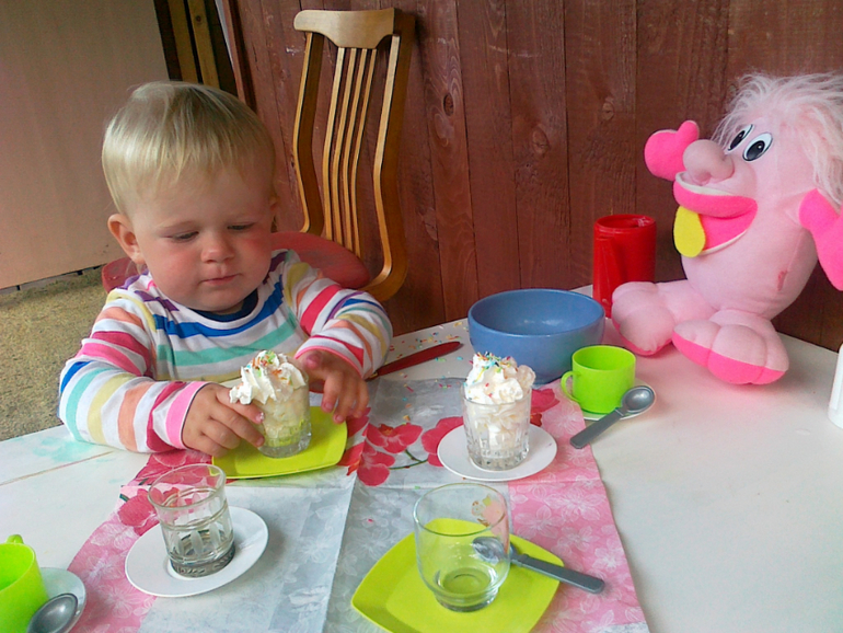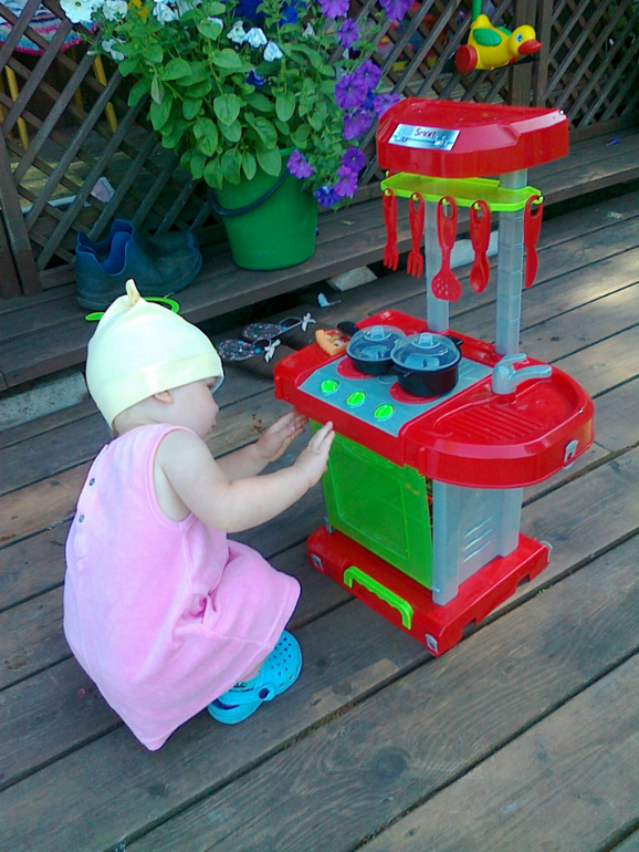 В полтора года пора активно начинать вводить ролевые игры. Решили устроить чаепитие для кукол, но не просто, а с самолепленными пирожными. Идея не нова, но у нас получился свой вариант. "Тесто" сделать очень легко - смешайте бальзам для волос с обычным крахмалом в подходящей пропорции, чтобы получилась масса для лепки. Можно добавить краску или пищевой краситель для цвета. у нас получилось клубничное и фисташковое тесто. Мы слепили из него шарики на скорую руку, положили в кондитерские юбки для маффинов, потом Маша посыпала их настоящей кокосовой стружкой и присыпками для тортов. Разливала чай и раздавала угощение. Ей так понравилось, что игра "накорми кукол" стала у нас постоянной. Уборки, конечно, много, но это того стоит!