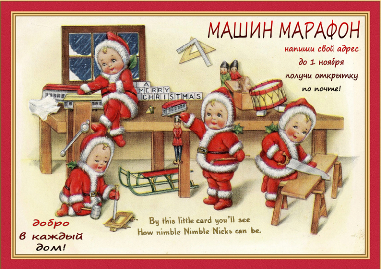 Новый год за горами? Вспомните как пролетело лето! Мы с Машей решили стать помощниками Деда Мороза! Мы объявляем МАРАФОН! До 1 ноября 2015 года пришлите нам свой полный почтовый адрес (в комментах или личным сообщением) и получите от нас настоящую открытку ручной работы! Добро в каждый дом!