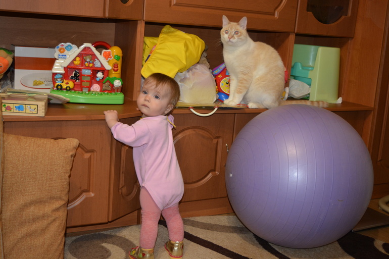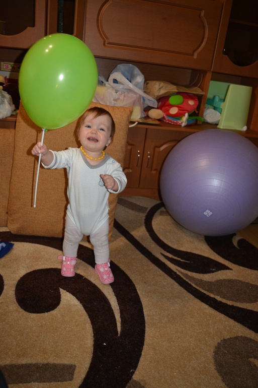 Ходит очень хорошо за ручку, сама может несколько шагов сделать, но боится. Только если я стою перед ней, то может 3-4 шага навстречу сделать. Стоит без опоры очень хорошо!