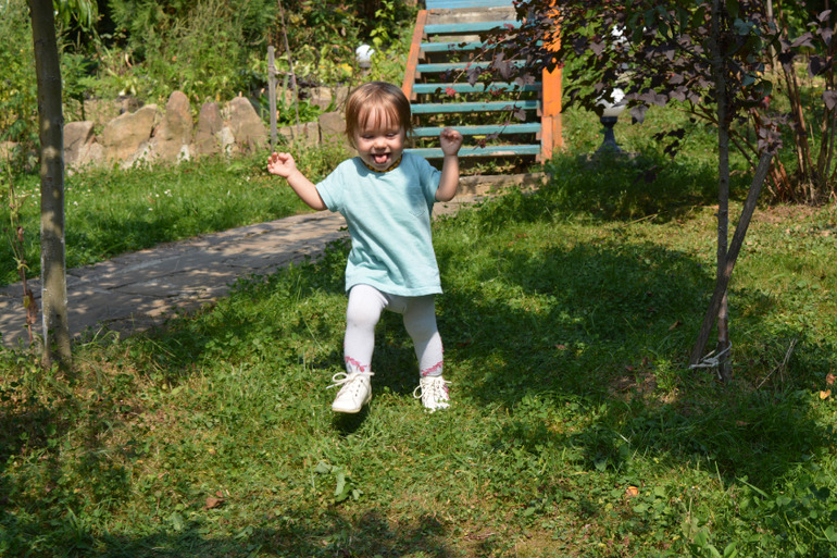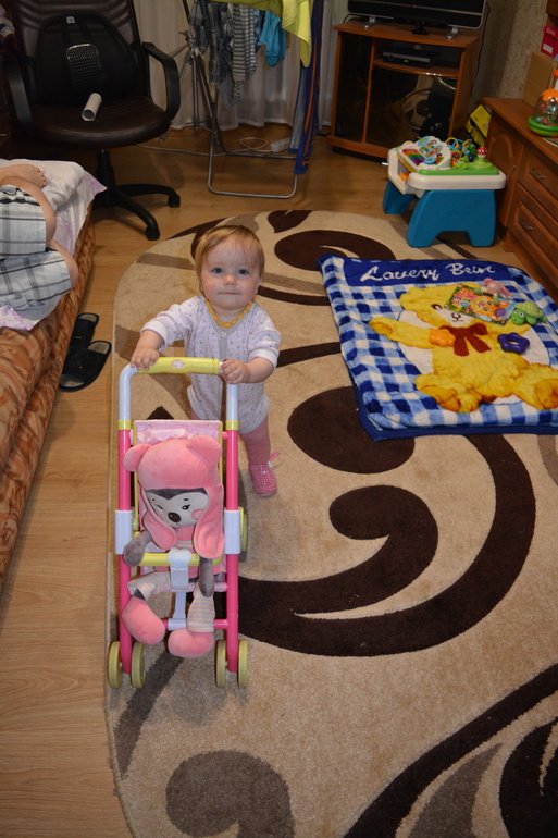 Уже начали ходить на прогулке, сначала за ручку, а потом отпустила. Она постояла возле коляски, а потом отпустила ручку и потопала изучать окружающий мир. Кстати, на улице охотнее ходит сама, чем дома. Дома делает несколько шагов сама и требует дать ей руку.