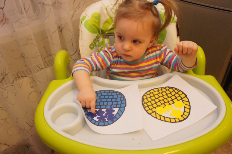 Переместились мы на кухню и сделали чудесную аппликацию, рассортировав цветочки по корзинкам. Пока в аппликациях Арише больше всего нравится мазать клеем, и отобрать его потом очень нелегко.