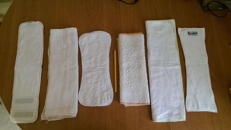 Слева направо:вкладыш из орг.хлопка Флип для тренировочных трусиков,Марья дисаны сложенная гармошкой в три сложения,анотомический вкладыш наппи в среднем размере, махрушечка мокоша, байковая пеленка NaturLife, конопляный вкладыш Бабиидеа.