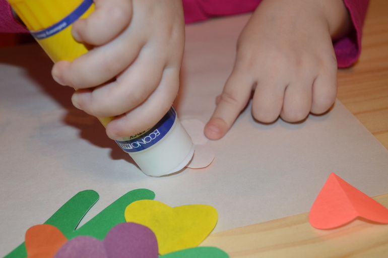 Потом наступила очередь Катюши творить! Наклеиваем листочки-сердечки с помощью клея-карандаша на дерево.